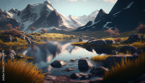 Obraz premium Ethereal Mountain Landscape with Exquisite Greenery and Subtle Hints of Winter. Generative Ai
