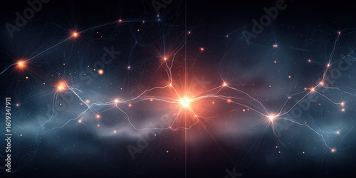 © Jasion, Fototapeta premium Ethereal Neuron‑Like Web with Glowing Nodes & Red‑Orange Central Flare