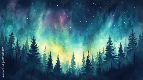 © Theeranan, Naklejka premium Ethereal Night Sky Over Tranquil Pine Forest with Colorful Aurora Borealis and Starry Background in a Dreamlike Watercolor Painting