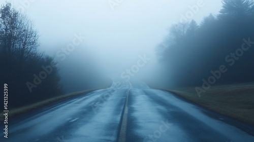 Fototapeta premium Ethereal passage, A road vanishing into the embrace of dense fog
