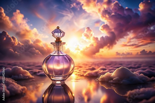 Obraz premium Ethereal Perfume Bottle in Dreamy Sunset Cloudscape - High Depth of Field...