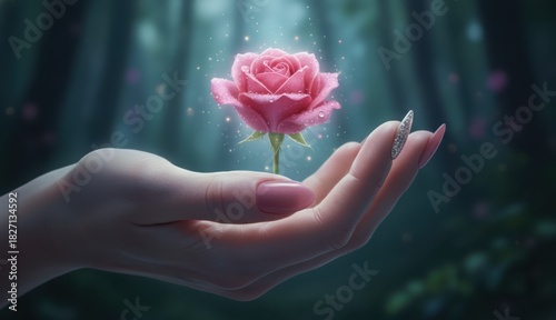 © DisignUA, Naklejka premium Ethereal pink rose with sparkling water droplets held gently in a manicured hand against a dark, mystical forest background.