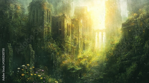 Fototapeta premium Ethereal ruined city backdrop with moss-covered rooftops wildflowers and golden beams