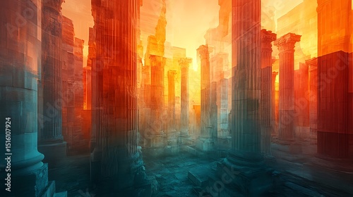 © byakuyaai, Obraz premium Ethereal ruins bathed in the glow of sunrise: Architectural fantasy landscape