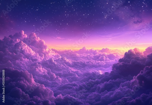 Fototapeta premium Ethereal Sky at Dusk with Vibrant Purple and Pink Clouds Illuminated by Twinkling Stars Under a Deepening Blue Horizon