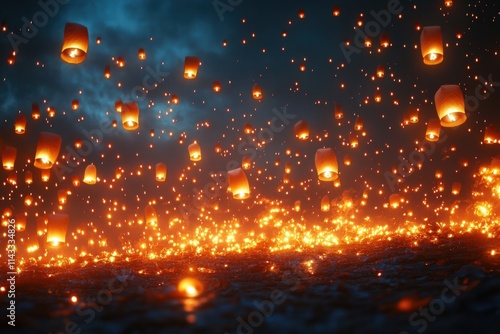 © wannathon, Fototapeta premium Ethereal Sky Filled with Floating Lanterns under Dramatic Night Sky