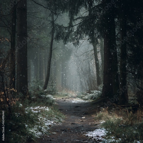 Naklejka premium Ethereal snowfall in a dense forest creates an enchanting atmosphere of...