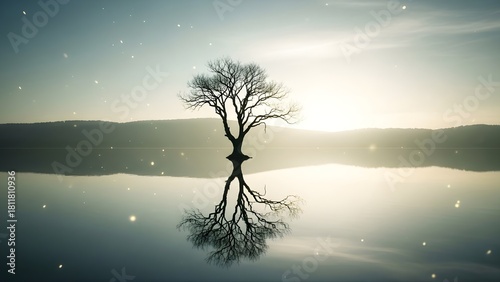 Obraz premium Ethereal Solitary Tree Reflection in Still Water - Tranquil Nature Healing...