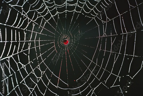 Fototapeta premium Ethereal Spider Web with Red Gemstone Eye on Black Background