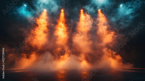 Naklejka premium Ethereal Stage Ambiance: Three beams of vibrant orange and blue spotlights pierce through a swirling curtain of fog, creating a mesmerizing scene of theatrical intrigue.