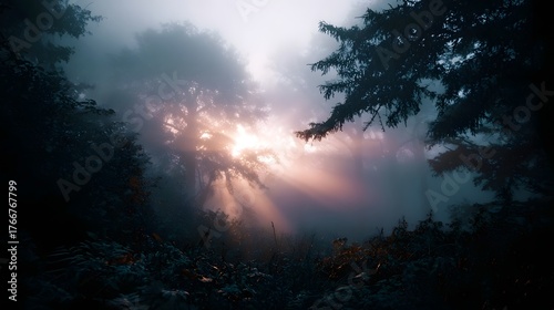 Fototapeta premium Ethereal sunbeams pierce through dense fog in a mysterious forest at dawn