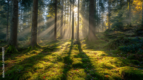 Fototapeta premium Ethereal Sunbeams Piercing Through Dense Forest Canopy Illuminating Moss-Covered Ground in Mystical Woodland Scene