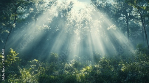 Obraz premium Ethereal sunlight filters through a dense forest, illuminating the greenery...
