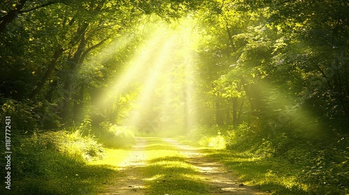 © Kitta Studio, Fototapeta premium Ethereal Sunlight Illuminating Forest Pathway in Tranquil Nature Scene
