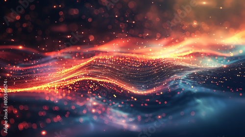 Fototapeta premium Ethereal tech landscape, panoramic, circuits weaving through mystical light, softfocus, magical