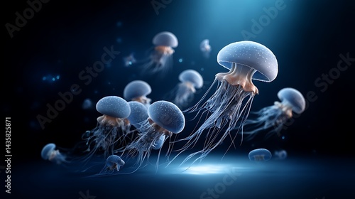 © Alexar_JavaCreator, Naklejka premium Ethereal underwater photography of glowing bioluminescent jellyfish in deep sea ocean night scene
