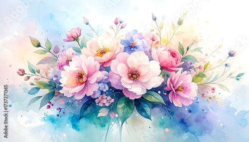 © Bisnin, Fototapeta premium Ethereal Watercolor Floral Arrangement in Pastels