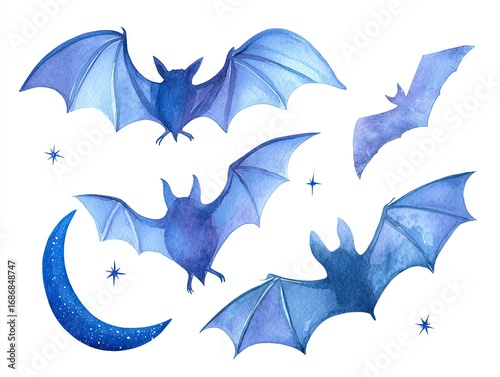 © Darunee, Fototapeta premium Ethereal Watercolor Halloween Clipart Set with Bats and Moon on White Background
