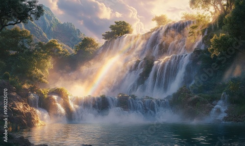 © Аrtranq, Fototapeta premium Ethereal Waterfall with Rainbow Amidst Lush Nature