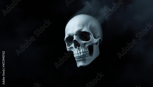 Fototapeta premium Ethereal white skull emerging from dark smoke against a black background
