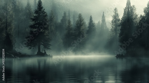 © Photock Agency, Fototapeta premium Ethereal Wilderness: Misty Lake Surrounded by Towering Evergreens