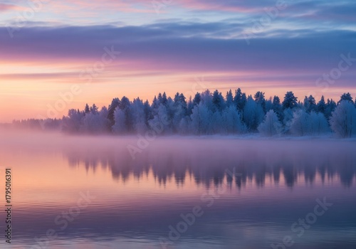 Fototapeta premium Ethereal winter morning with frost-covered trees reflected in a misty, calm...