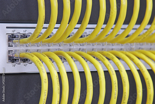 © Larisa, Obraz premium Ethernet data switch with connected cables with Rj45 connector. Close-up. Soft focus.