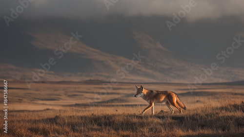 © tiagozr, Fototapeta premium Ethiopian wolf walking through highland grassland.