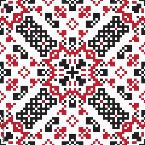 Fototapeta premium Ethnic geometric pattern. Black, red and white seamless background. Pixel...