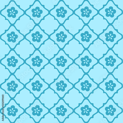 © หัทยา เที่ยวกลาง, Fototapeta premium Ethnic geometric pattern, floral pattern, oriental colors, seamless, seamless pattern, flowers, white, blue background design for fabric, curtain,