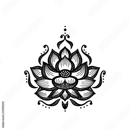 © AllNikArt, Fototapeta premium Ethnic Oriental Tattoo Mehndi Lotus Flower Symbol Line Black and White Vector Illustration. Ornamental Floral Pattern