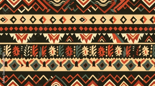 © Warunee, Fototapeta premium Ethnic pattern, seamless, earthy tones, handdrawn tribal motifs, digital art, rustic and authentic design, detailed and intricate, cultural heritage