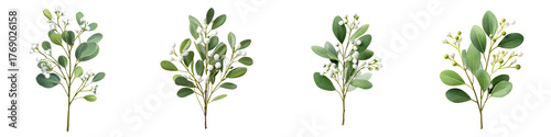 © R Studio, Naklejka premium Eucalyptus Branches with Flowers Set on White Background