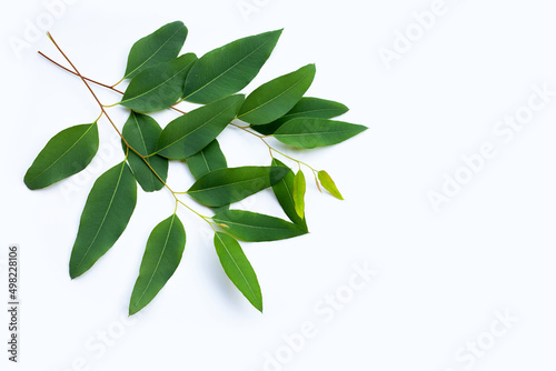 © Bowonpat, Obraz premium Eucalyptus leaves on white background.