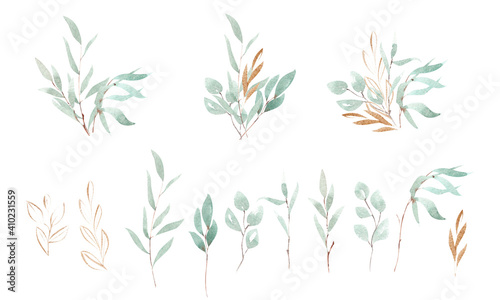 © Анастасия Гусарова, Naklejka premium eucalyptus set. Watercolor hand painted bouquets and branches isolated on white background. Suitable for the design of invitations, greeting cards, social media posts.