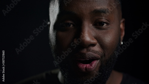 © stockbusters, Fototapeta premium Euphoric afro guy posing indoors. African man saying wow on black background