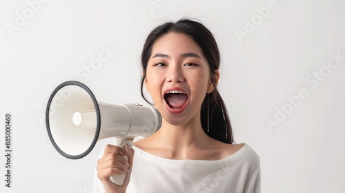 © ckybe, Naklejka premium Euphoric Asian lady loudly declaring positive update or advancement alone on blank backdrop.