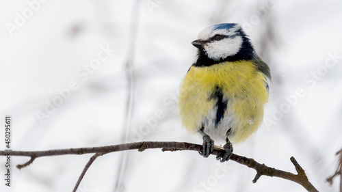 Fototapeta premium Eurasian blue tit (Cyanistes caeruleus) eating from bird feeder in snow