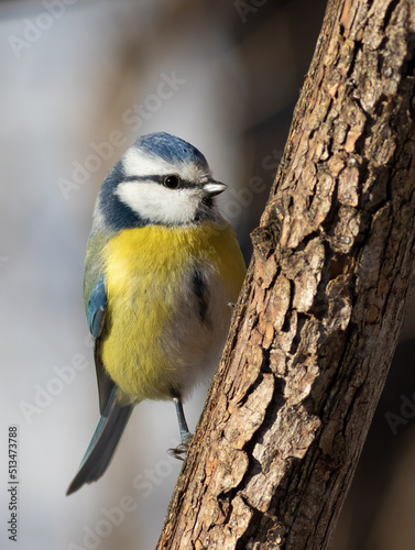Fototapeta premium Eurasian blue tit, Cyanistes caeruleus. On a sunny morning a bird sits on the trunk of a thin tree