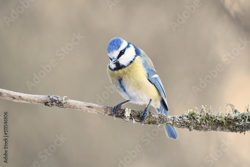 Obraz premium Eurasian blue tit (Cyanistes caeruleus) sitting on a branch.