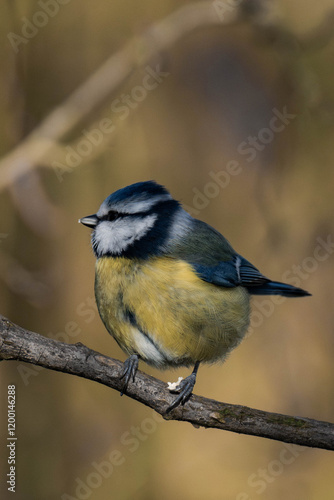 Obraz premium Eurasian blue tit (Cyanistes caeruleus) sitting on a tree branch