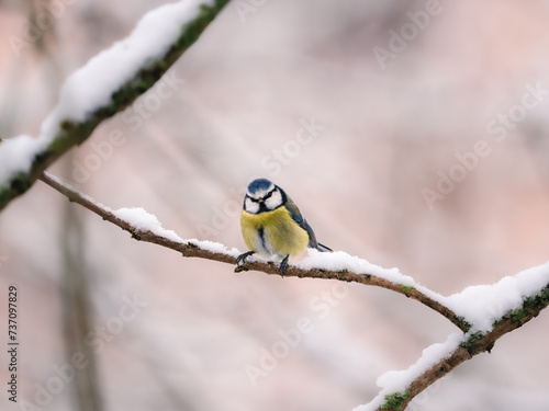 Fototapeta premium Eurasian blue tit perched on a snowy tree branch