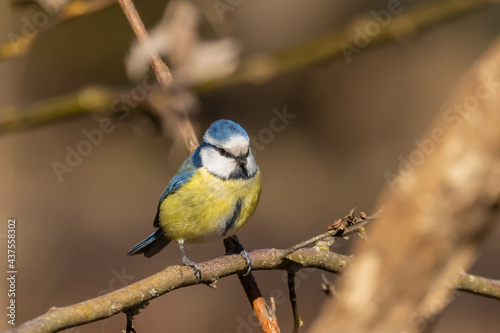 © Masood, Obraz premium Eurasian blue tit sitting on a branch at sunset