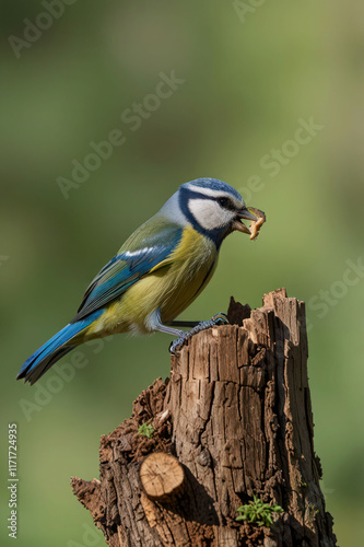 © Hameeda, Fototapeta premium Eurasian blue tit taking off from stump with food in the beak, clean green background