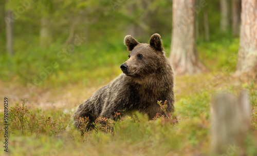 Fototapeta premium Eurasian Brown bear lying on grass in forest