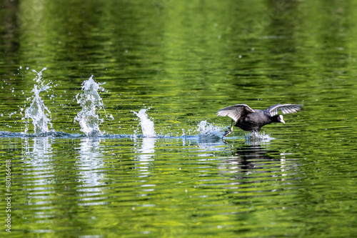Fototapeta premium Eurasian coot, Fulica atra chasing each other by running across the water