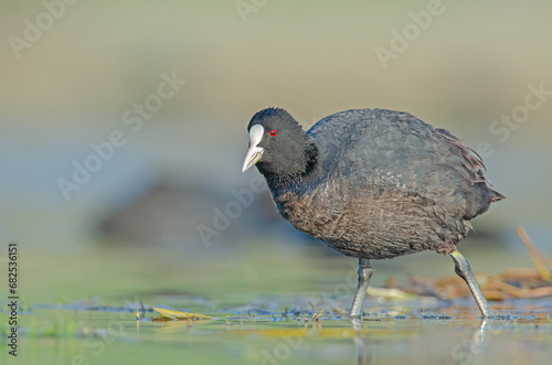 Obraz premium Eurasian Coot (Fulica atra) feeding on the lake shore.