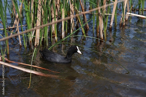 © Constellaurum, Fototapeta premium Eurasian coot, or common coot, or Australian coot (Lat. Fulica atra) of Rallidae family swimming among reeds. Adult aquatic bird. Black red-eyed waterbird.