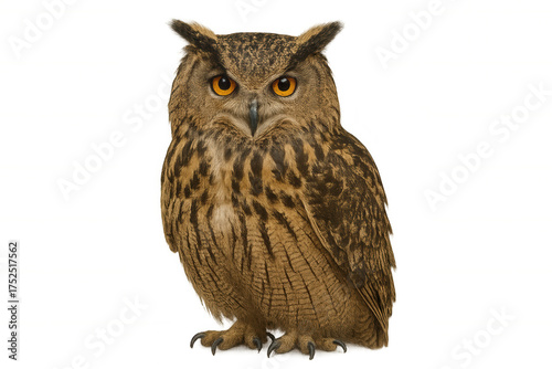 Naklejka premium Eurasian eagle owl standing, looking directly, nocturnal predator, wisdom symbol, wildlife bird with orange eyes