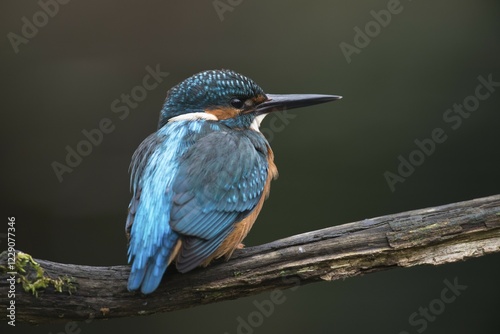 Fototapeta premium Eurasian kingfisher (Alcedo atthis) sitting on tree branch, male, Emsland, Lower Saxony, Germany, Europe